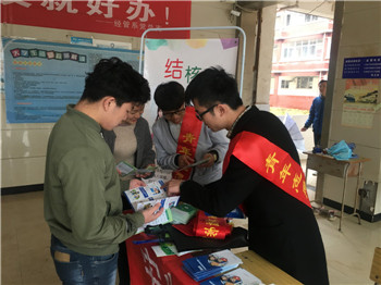志愿者们悬挂宣传横幅、摆放宣传展板、散发宣传单和宣传折页
