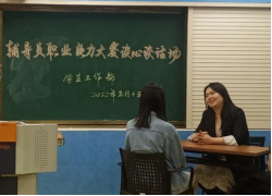 辅导员老师们认真备考。在谈心谈话部分,辅导员和学生都沉浸在各自的角色里,学生们倾心吐胆,辅导员们和蔼可亲,循循善诱,对学生动之以情,晓之以理,俨然学生的良师益友。