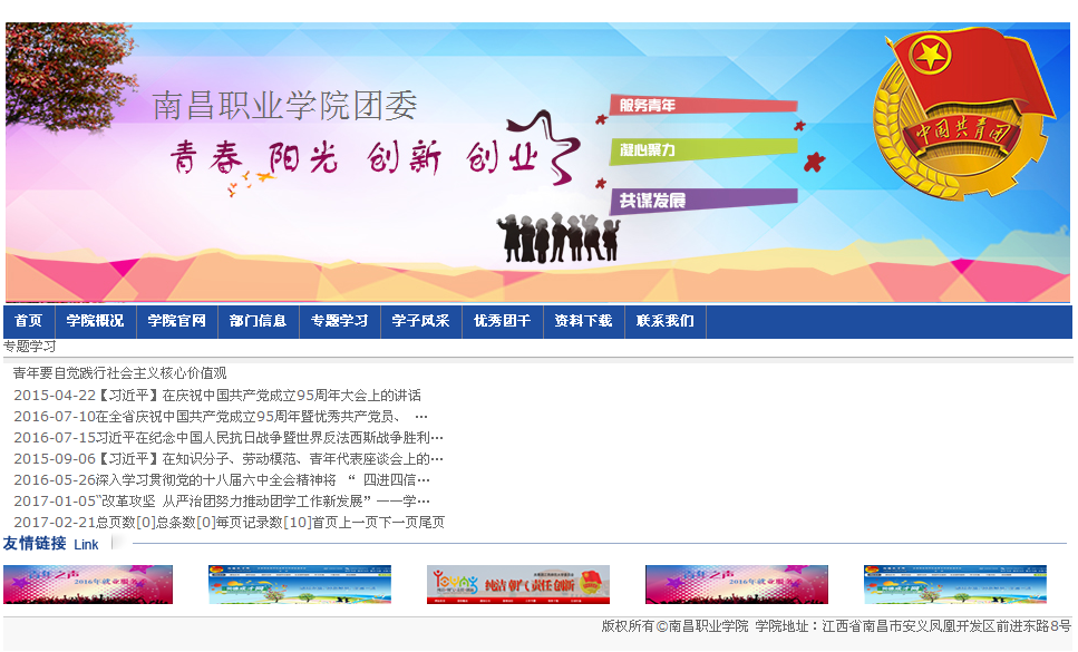 学院党委要求团委网站开设专题学习板块,用新媒体网络平台的方式传递党政信息和领导人讲话,学院团委网上先后刊登中共中央总书记、国家主席、中央军委主席习近平同志《在知识分子、劳动模范、青年代表座谈会上的讲话》、《习近平在纪念中国人民抗日战争暨世界反法西斯战争胜利70周年大会上的讲话》、团中央书记处书记傅振邦同志《“改革攻坚 从严治团努力推动团学工作新发展”——学校共青团2017年主题报告 》、原江西省委书记强卫《在全省庆祝中国共产党成立95周年暨优秀共产党员、 优秀党务工作者、先进基层党组织表彰大会上的讲话》等专题学习文章等7篇。